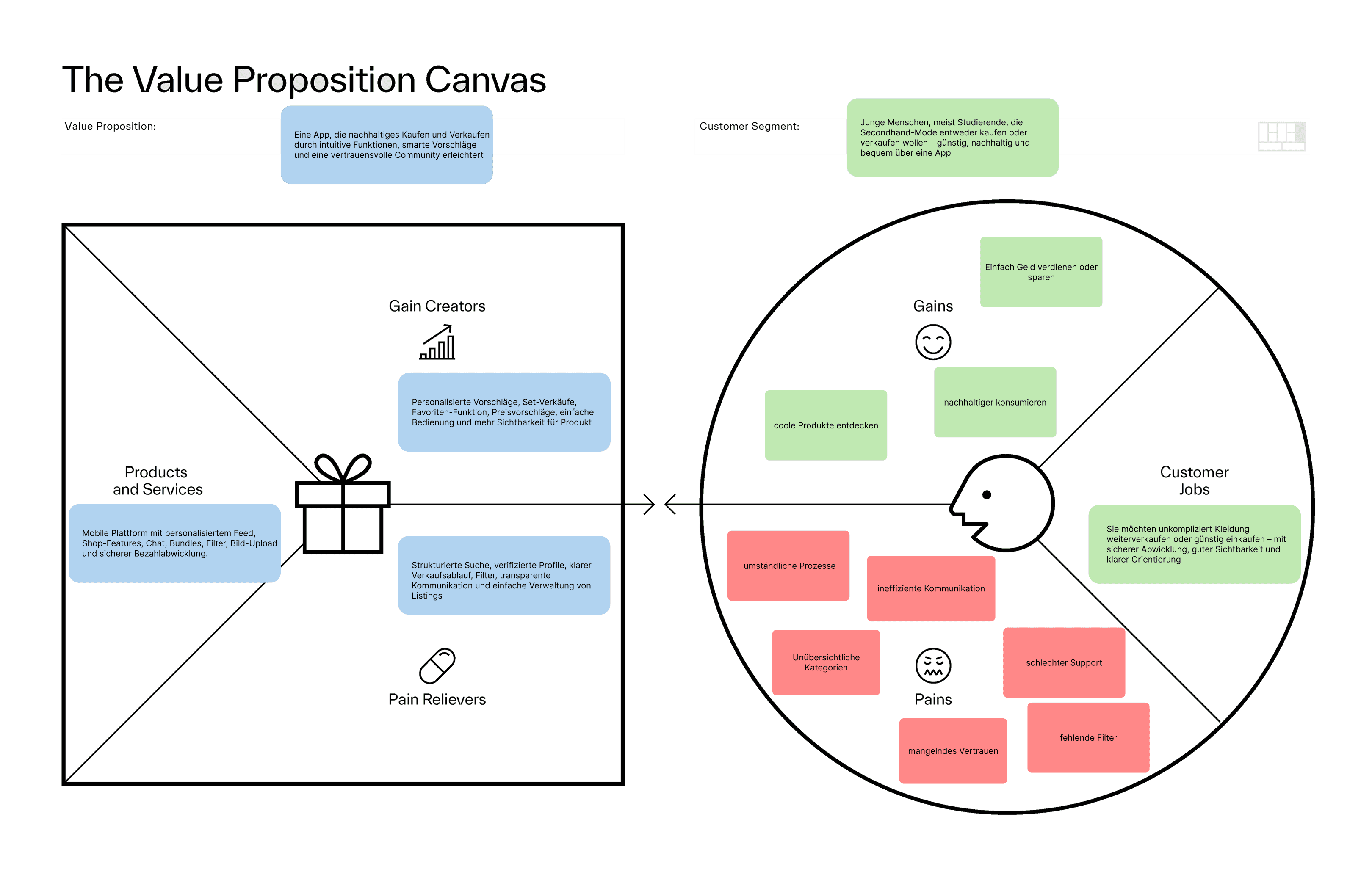 Im Projekt haben wir den Problemraum der Vinted-App analysiert, das bestehende Werteversprechen neu bewertet und Nutzer:innenbedürfnisse in einem priorisierten Werteversprechen zusammengeführt. Durch iterative User Research, Value Proposition Canvas und Prototyping konnten wir unsere Lösungen kontinuierlich validieren und optimieren. Dabei haben wir besonders gelernt, wie wichtig klare Teamkommunikation, ein gemeinsamer Styleguide und ein definierter User Flow für eine konsistente und effiziente Zusammenarbeit sind. Zudem hat uns die intensive Auseinandersetzung mit Nutzer:innenfeedback gezeigt, wie entscheidend eine menschenzentrierte Herangehensweise für erfolgreiche digitale Produkte ist.