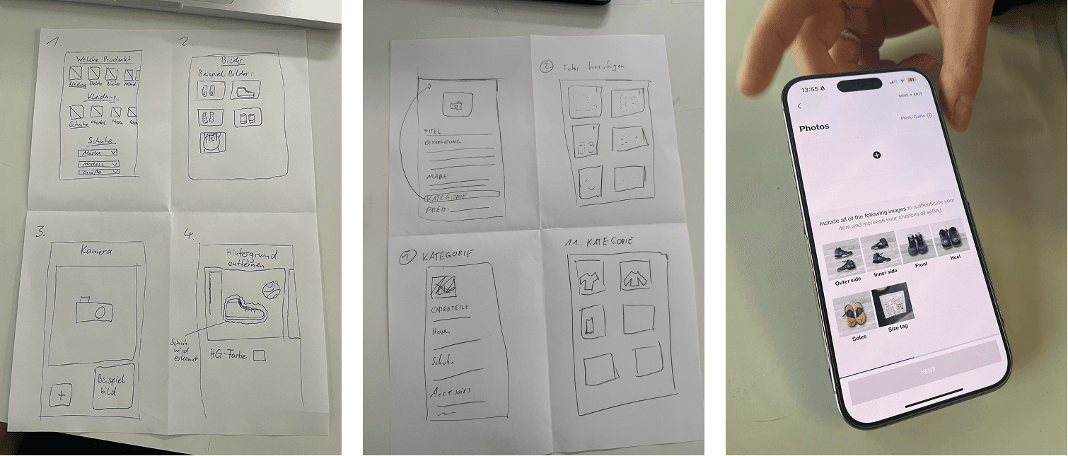 Im Strategieprozess nutzten wir die Erkenntnisse aus unserem Research gezielt, um klare Ziele und Prioritäten für das Redesign der Vinted-App zu setzen. Aus den formulierten „How Might We“-Fragen identifizierten wir die wichtigsten Fokusfunktionen, für deren kreative Ausarbeitung wir Methoden wie Crazy Eights einsetzten. Dabei war es uns wichtig, das Werteversprechen neu auszurichten, um die Bedürfnisse der Nutzer:innen besser zu erfüllen und uns gleichzeitig klar im Wettbewerbsumfeld zu positionieren. Unsere Strategie zielte darauf ab, Vertrauen zwischen Käufer:innen und Verkäufer:innen zu stärken sowie inspirierenden Content hervorzuheben, der die Community aktiviert. Durch die strukturierte Herangehensweise konnten wir sicherstellen, dass Designentscheidungen sowohl nutzerzentriert als auch zielgerichtet getroffen wurden.