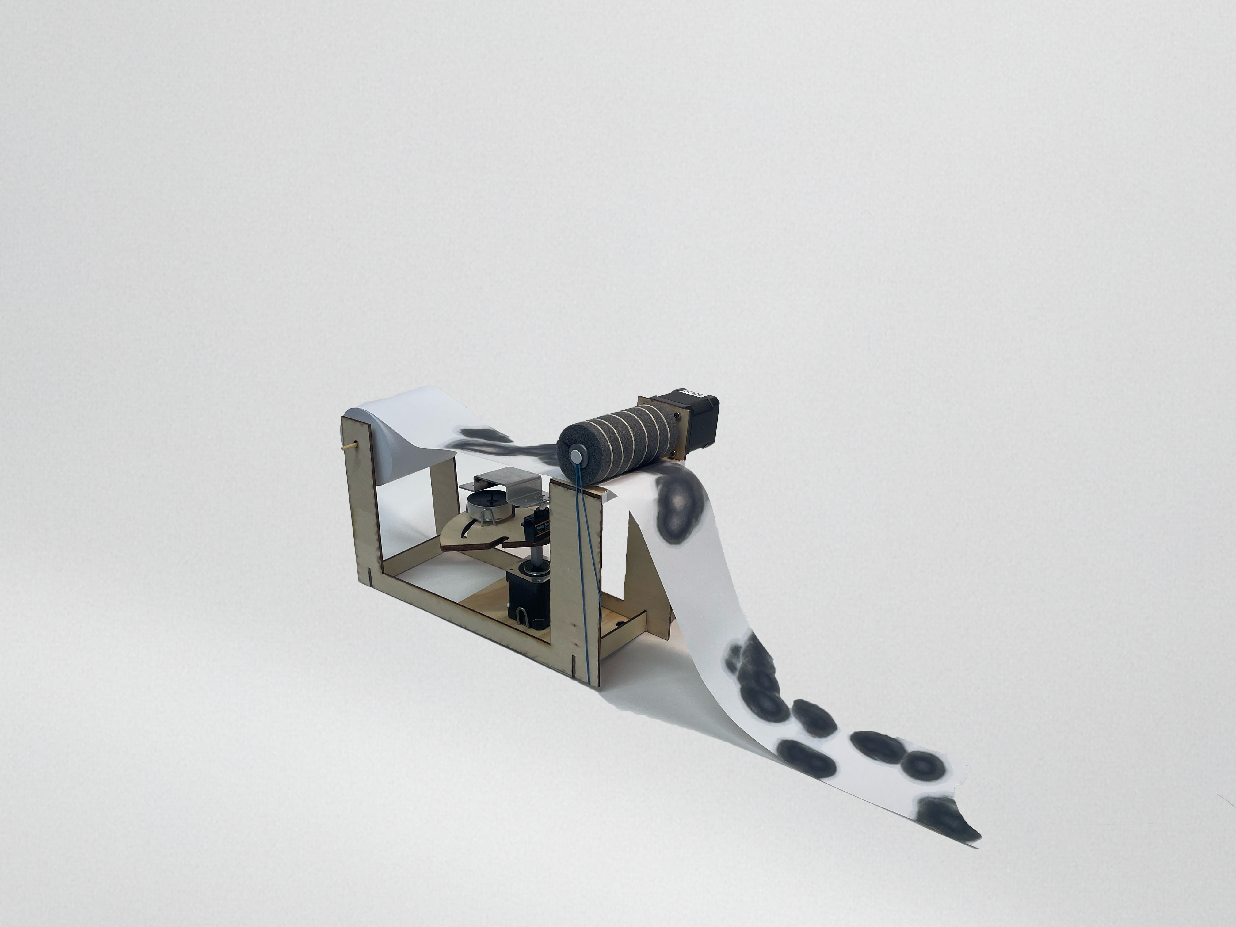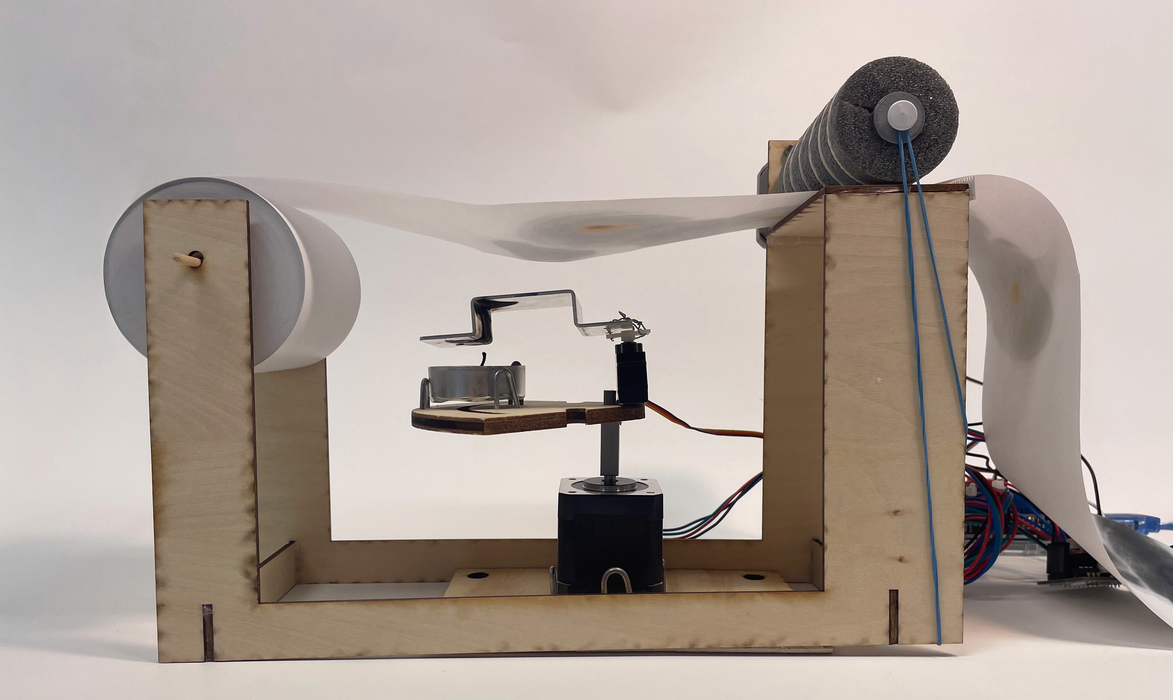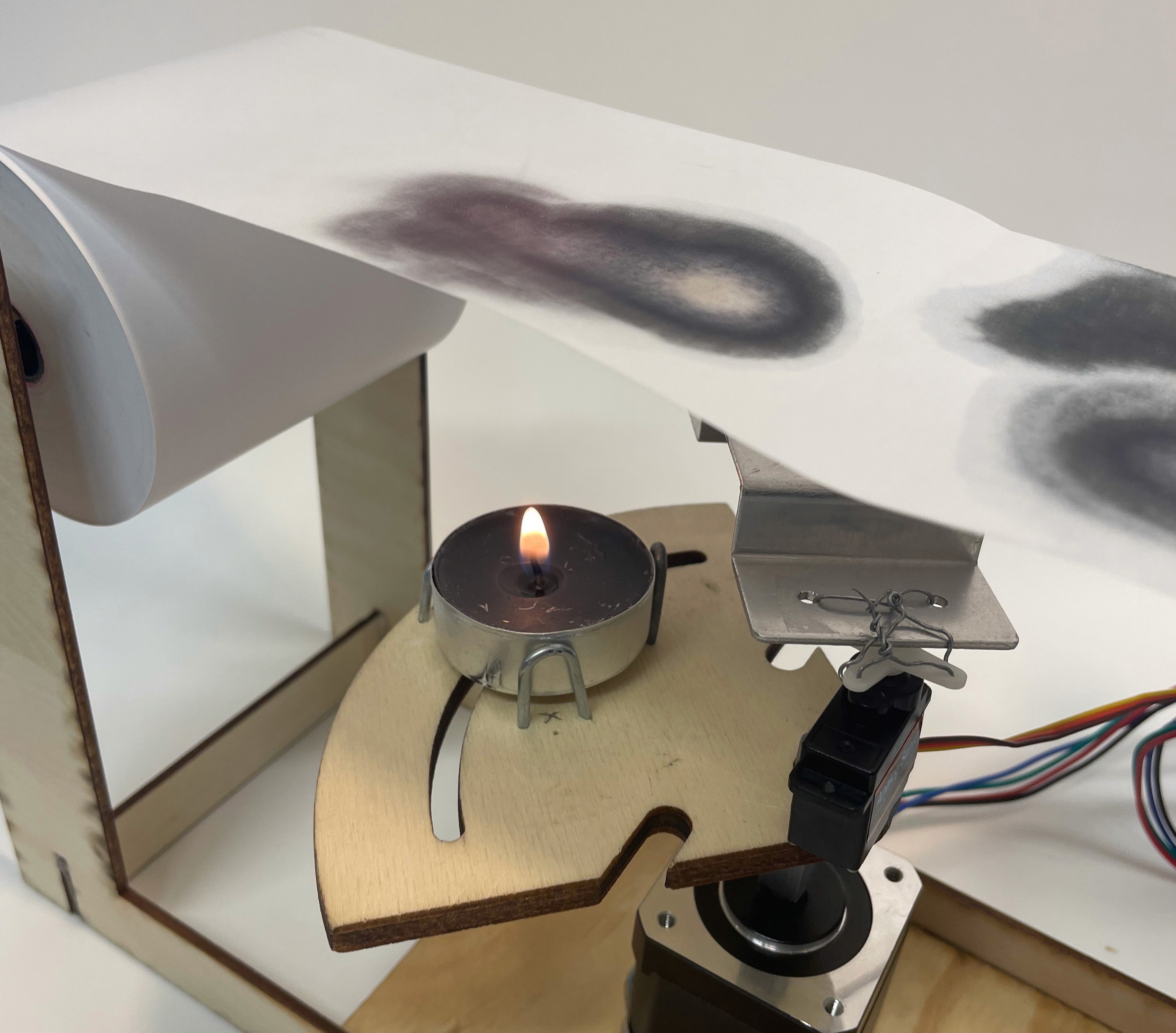 Das Gerät besteht aus einer Halterung für die Kassenbonrolle, zwei Stepper Motoren, einem Servo Motor und einem Arduino. Das Thermopapier wird von einem Motor in kontrollierten Abständen weitergezogen. Eine feuerfeste Metallplatte auf dem Servo kann die Flamme mechanisch abdecken oder freigeben, um die Hitze zufällig auf das Papier wirken zu lassen. Die Konstruktion garantiert ein gleichmäßiges Spannen des Papiers – inspiriert von technischen Elementen, die im Alltag genutzt werden.