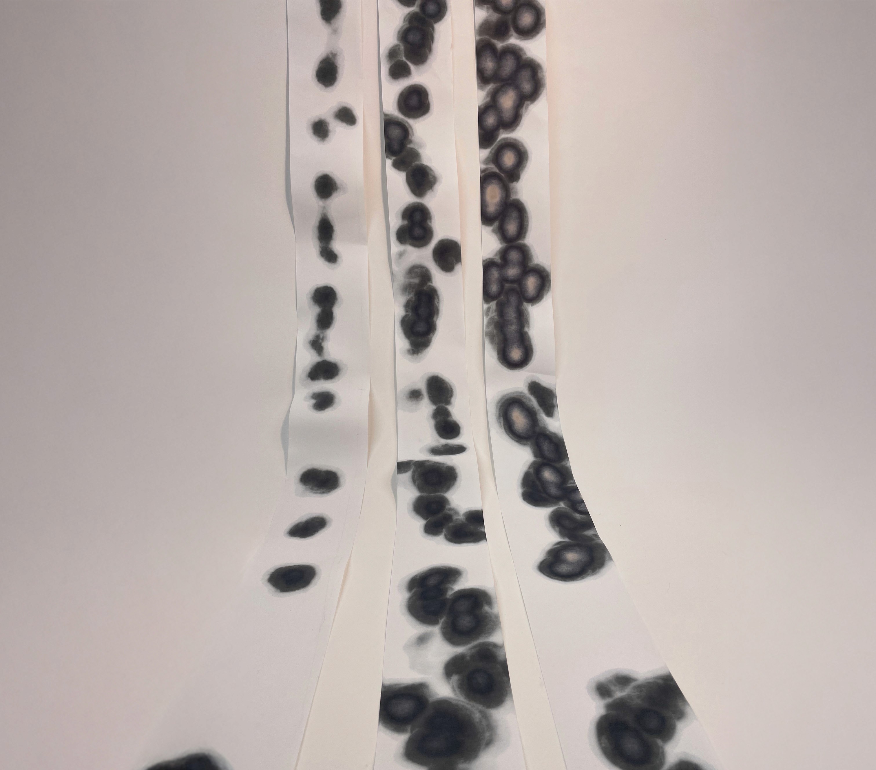 Das Ergebnis sind schwarze Punkte und Muster, die durch die Hitze auf dem weißen Thermopapier entstehen. Die Positionen und Zeitintervalle werden zufällig gesteuert, wodurch jede Zeichnung einzigartig ist und das visuelle Ergebnis stets variiert.